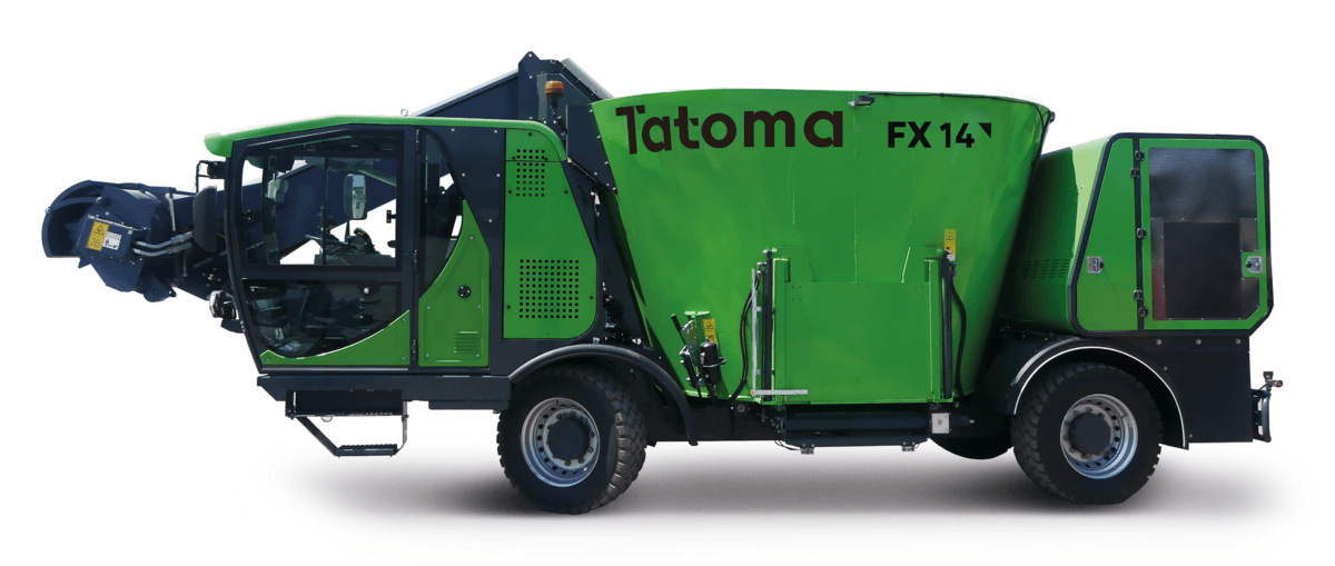 Mélangeuse automotrice de 14 m3 à vis verticale. Conception compacte permettant une bonne maniabilité. Grande cabine offrant une visibilité sur tous les travaux de chargement et de déchargement. Suspension des essieux assurant une bonne adhérence sur tous les terrains. 2 roues motrices, 4 roues directrices, homologuée route. L'expérience de TATOMA X LINE dans le mélange permet d'obtenir une ration homogène et aérée pour ingestion optimale par les animaux.