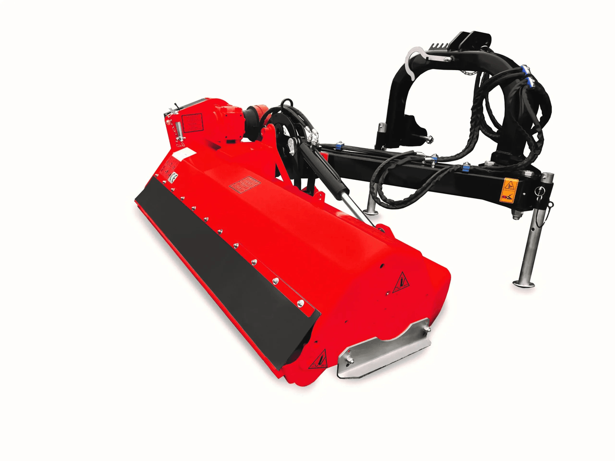 . Attelage 3 points cat. 1, boîtier fonte 540 tours roue libre, patins latéraux réglables, rouleau arrière réglable, orientation hydraulique tête de broyage +90° – 50°, denture Y montée sur boulons, cardan simple homocinétique, sécurité mécanique sur l’attelage,