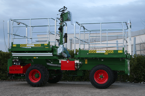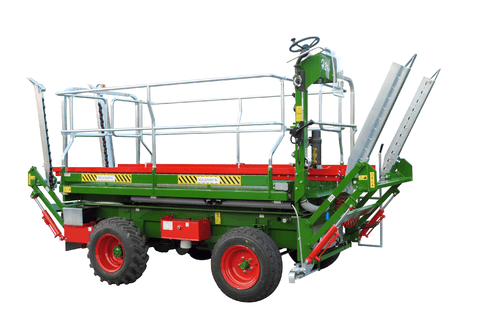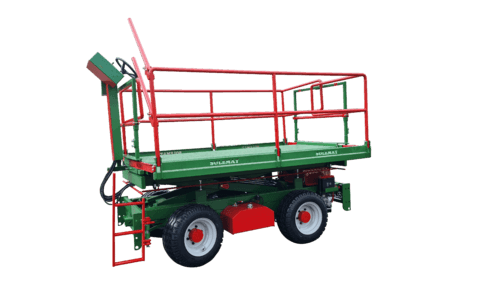 Plateforme unique à élévation hydraulique, ouverture électro hydraulique des balcons indépendante, largeur fermée 1m70 et ouverte 3m20, hauteur de levée 2m90 et longueur 3 m (PE3000) ou 4 m (PE4000), réservoir gasoil de 40 L, frein à disques, multi disques à bain d’huile (4 roues), barre de traction, boite de vitesse électrique, blocage de différentiel arrière à commande