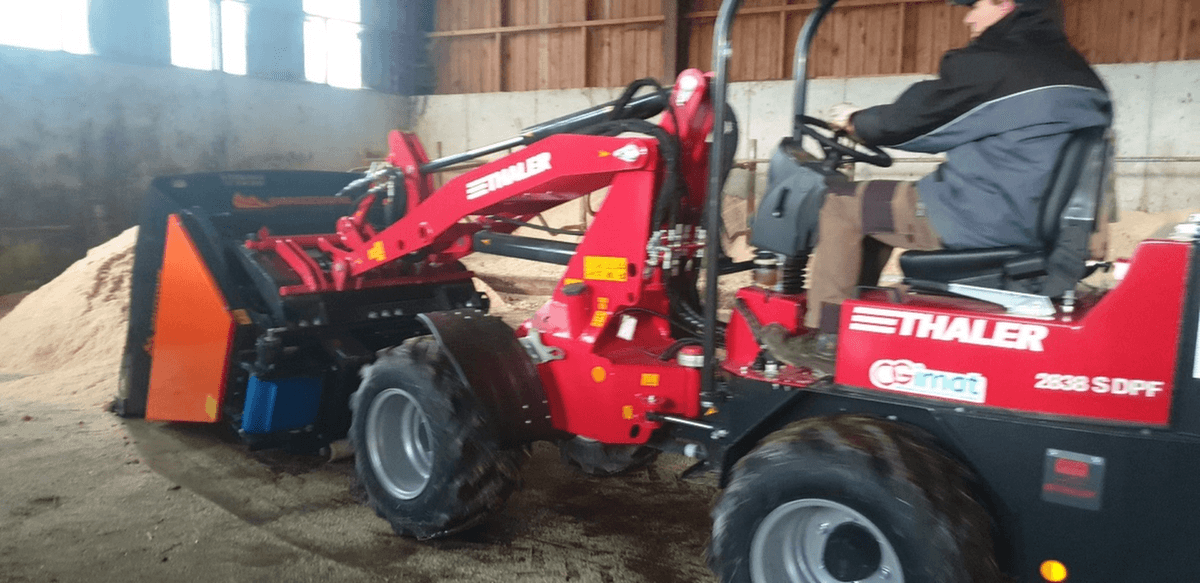Le BEDDING MASTER est un godet pailleur pour logette et distribue du vrac, sciure, paille courte, dolomie, sable, compost…Projette à droite ou à gauche à 50 cm jusqu’à 2,5 m suivant la matière, le débit hydraulique. Le volume va de 900 L à 3 600 L et la puissance nécessaire va de 30 cv à 65 cv en fonction des modèles de godet. La version ˝Profi˝ permet de distribuer le mélange chaux/paille/eau. Largeur du tapis de 30 cm ou 50 cm selon le modèle. Poids minimum du porteur valets de ferme, tracteur, télescopique entre 1 500 kg et 6 500 kg. Choix d’accessoires en option pour chacun.
