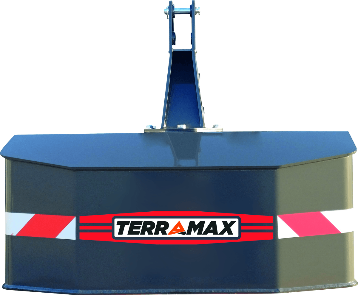 Masse ultra compacte, deux axes en chape sécurisée avec rotules d'attelage en CAT 3-2, fournies prêtes à être attelées avec axes et goupilles du 3 points.