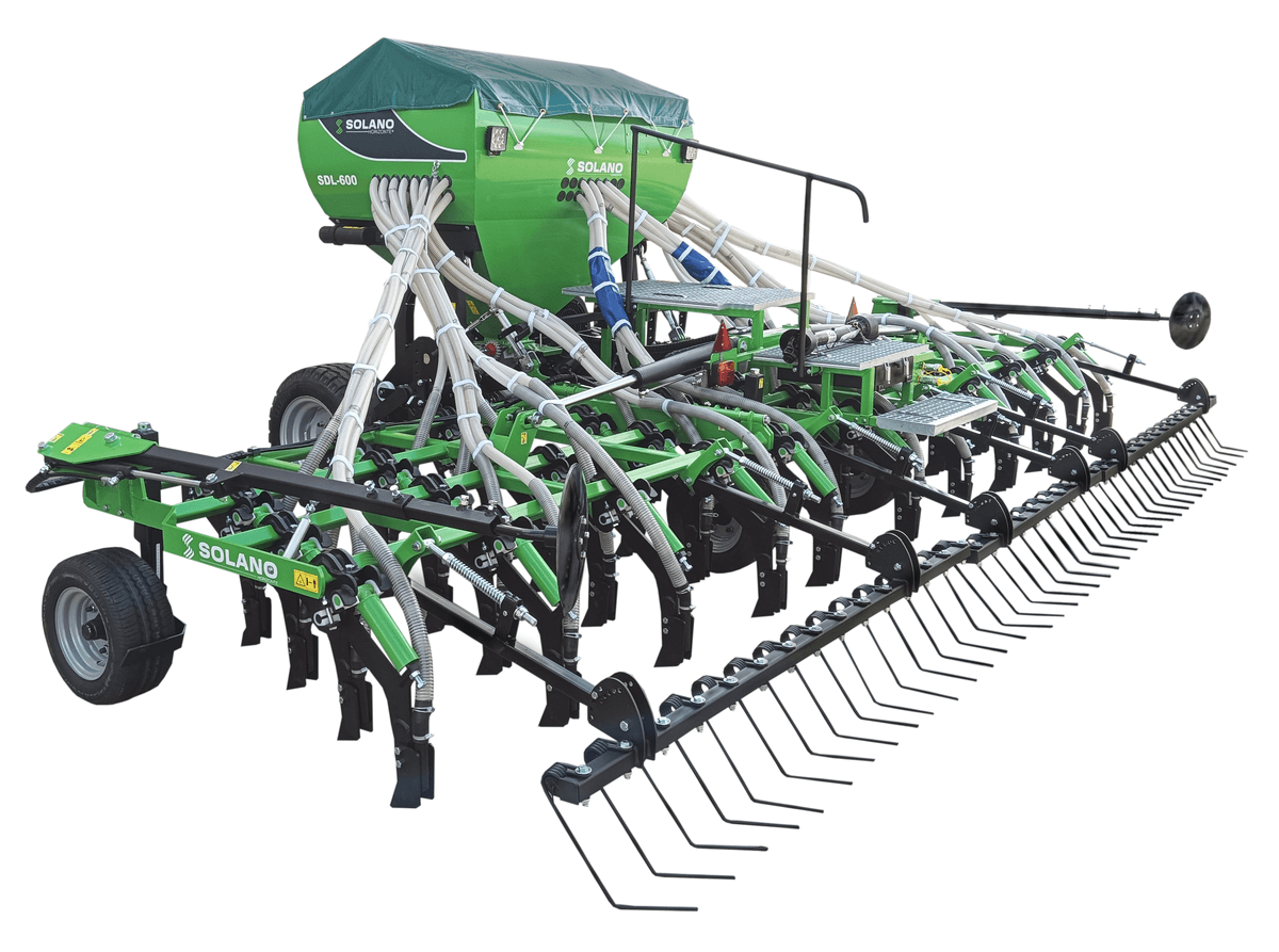 Le modèle SDL conçu pour travailler en semis simplifié se monte avec des dents de 12 mm à sécurité ressort (bagues en téflon) sur 4 rangées. Le sabot est démontable et renforcé au carbure. Il s’agit d’un modèle polyvalent qui peut aussi travailler en conventionnel et en direct. La trémie sur la version standard est de 1 600 L (en option, trémie 2 000 L).