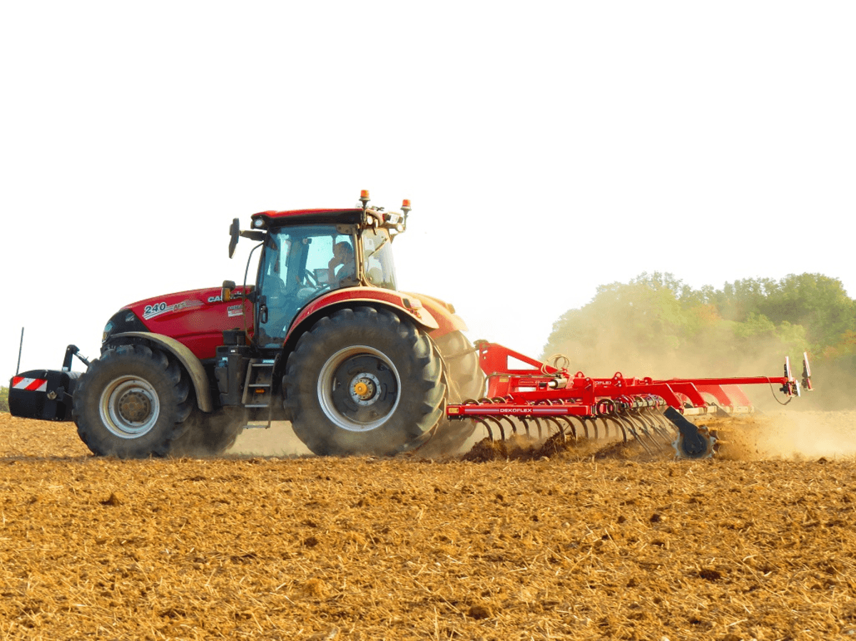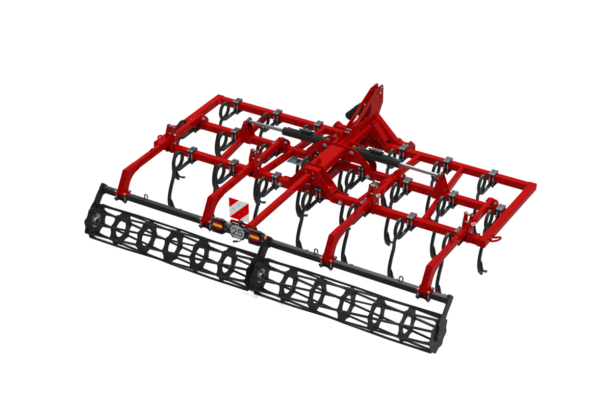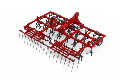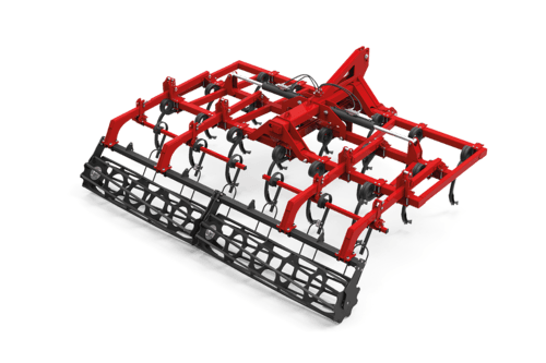 Largeur de travail 5,00 m, pour tracteurs de 150 à 200cv, 22 dents, rouleau barres carrées Ø500mm, repliable en 2 parties avec verrouillage, dent vibrante « Eurospire » (35x35 mm) assurant un bon déchaumage et mélange entre la terre et les résidus, réglage de profondeur de travail par système de broches.