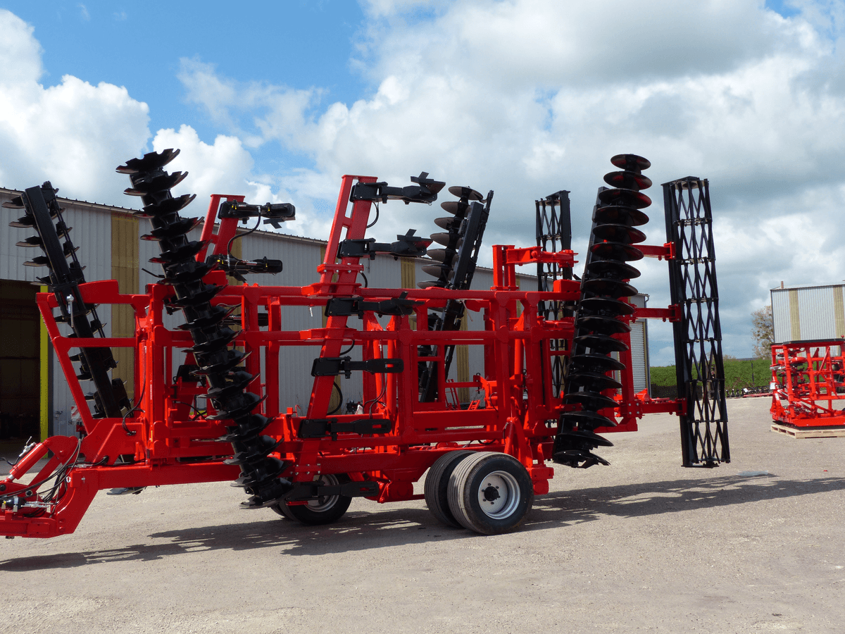 Châssis 4 poutres, 150 x 100 mm ou 200 x 100 mm selon le modèle, chariot 4 roues, jantes renforcées, essieu carré de 70, 6 axes, 2 vérins de relevage. Réglage d’ouverture des batteries par secteur. Arbre carré 40 mm, palier acier, roulements coniques triple étanchéité. Disques 660 mm écartement 230 mm et dents épaisseur 30 mm avec socs sabot à ailettes. Réglage en hauteur des dents par broche sécurité hydraulique avec boule d’azote.