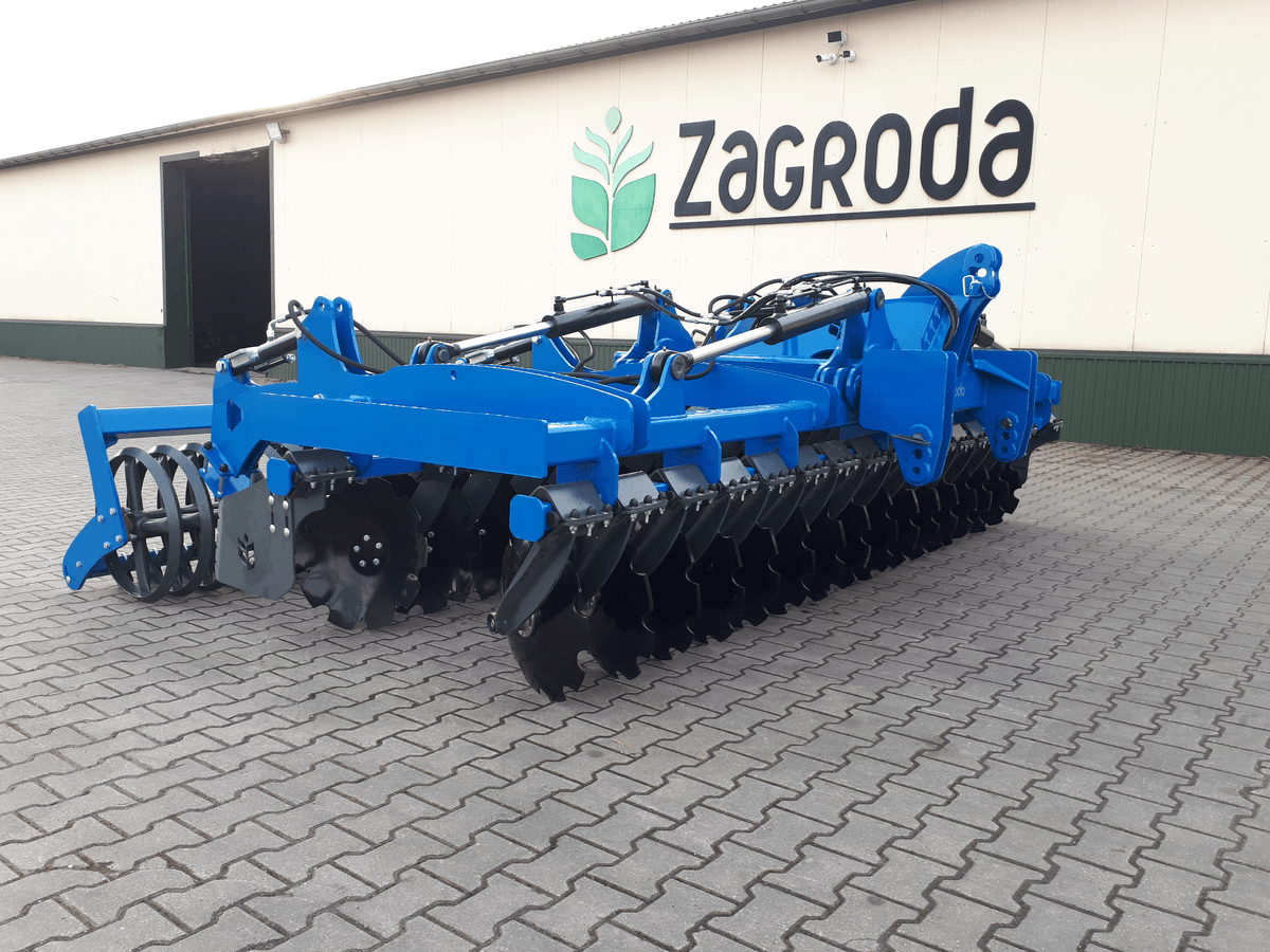2 rangées de disques diam 560mm, sécurité amortisseurs caoutchouc, déflecteurs latéraux réglables en hauteur, éclairage, terrage hydraulique, rouleau barre diam 600mm.