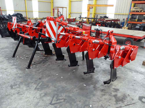 Disponible de 3 à 7 dents, épaisseur 30 mm, soc sabot en acier traité, dégagement sous châssis 750 mm. Sécurité par boulon de cisaillement. 2 roues de terrage pneumatiques, réglage par vis.