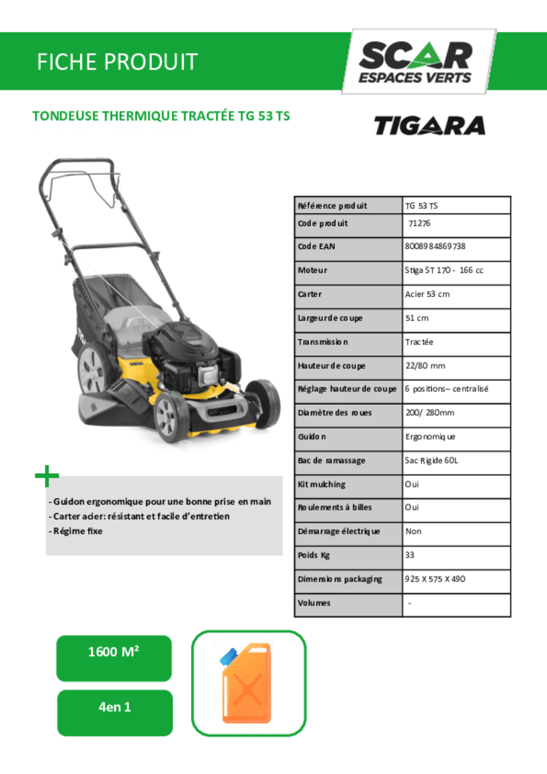 | Moteur | Stiga ST 170 starter automatique propulsé |