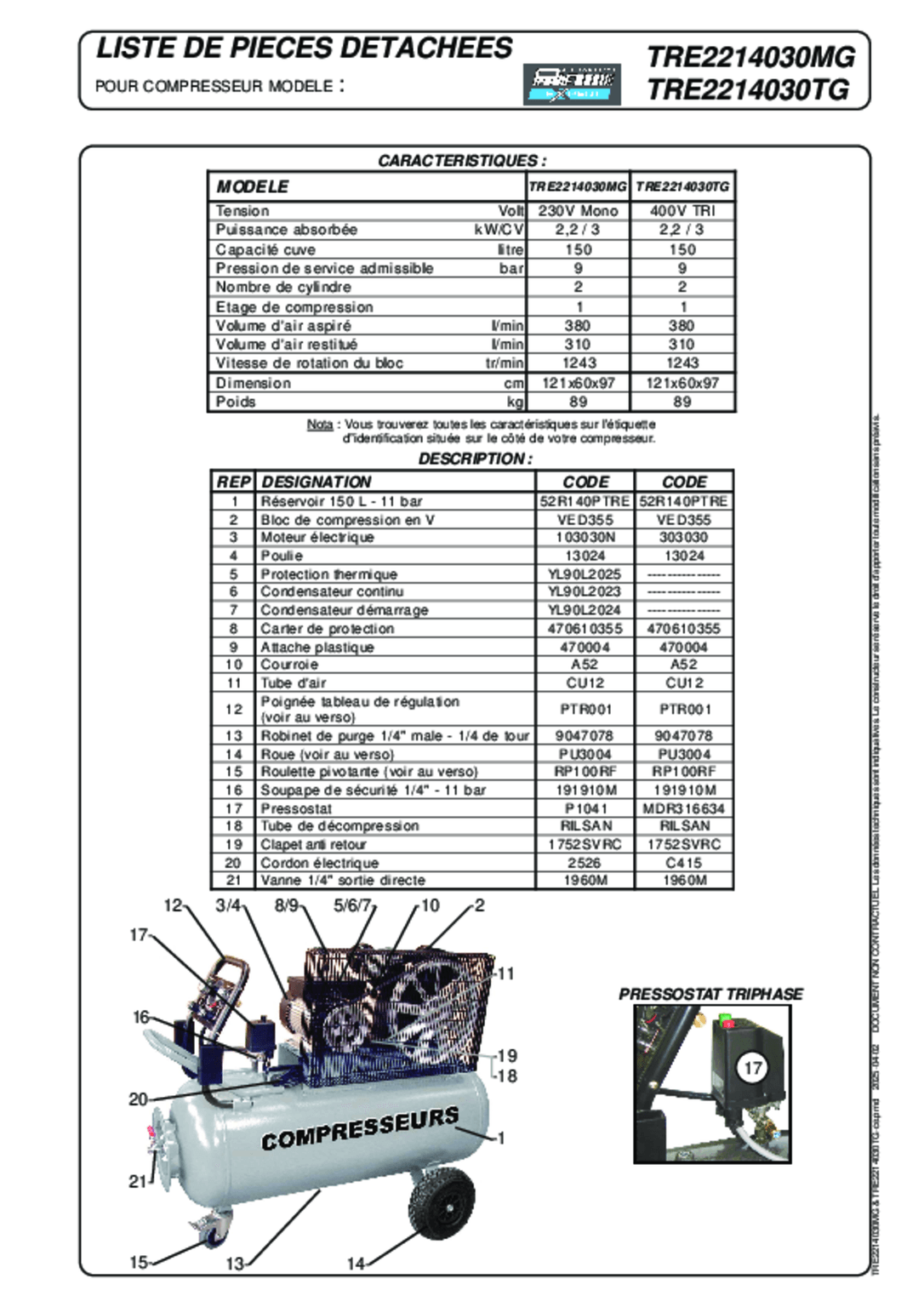 Débit aspiré : 380 L/min, débit restitué : 310 L/min, 9 Bar.