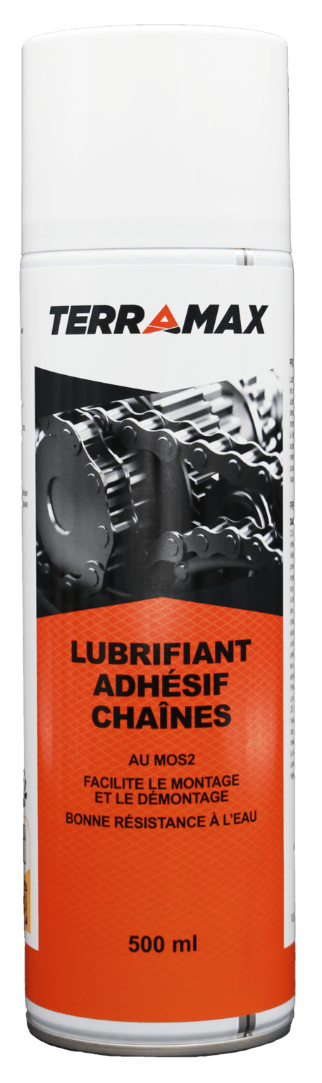 Lubrifiant adhésif chaîne. Pour chaînes et câbles divers. Au MoS2. Grande affinité de ce produit avec les surfaces métalliques. Facilite le montage et le démontage. Supprime les grincements des charnières, ressorts, serrures. Bonne résistance à l'eau. Permet une réduction des frottements. Possède une haute tenue à la température allant jusqu'à 450°C. Aérosol 500 ml.