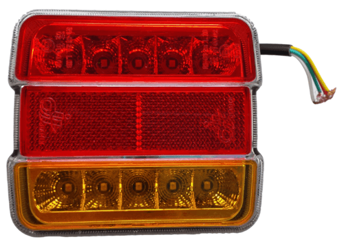 Fonctions : stop, veilleuse, clignotant, éclaireur de plaque. 12 V. Dim. : 110 x 97 x 36 mm.Entraxe de fixation : 55 mm. Polarité : +/-
