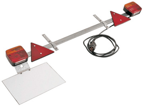 Tube en acier galvanisé rectangulaire 30x10 mm. Câble 7,5m, longueur 1,60m. 2 feux avec ampoules, 2 triangles réfléchissants, 2 pattes de fixation réglables, 1 support de plaque, 1 plaque d'immatriculation vierge, 1 fiche de 7 broches plastiques.