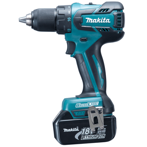 Modèle DDF459RMJ. Nombre de vitesse : 2. Régime à vide : 0 à 400 tr/min, 0 à 1500 tr/min. Couple de serrage maxi : 25 Nm. Couple de serrage maxi (franc) : 45 Nm. Couple réglable sur 16 positions + position perçage. Capacité : acier : 13 mm, bois : 38 mm. Capacité du mandrin : 1,5-13 mm. Poignée à revêtement Soft Grip pour plus de confort. Livrée avec : coffret MAK-PAC. Chargeur, batterie Lithium 18V/4 Ah, crochet ceinture.