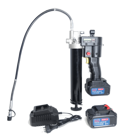 18 V. Compatible avec cartouche de graisse à visser ou standard de 400 g. Mallette rigide compartimentée comprenant : 1 pompe à graisse électrique 18 V, 2 batteries 18 V Li-ion rechargeables, 1 chargeur de batteries 220 V, 1 indicateur de charge, 1 flexible, 1 agrafe 4 mors. Batteries chargées en 2 h. Pression de travail : 400 Bar. Débit de graisse par minute : 85 g à 70 bar.
