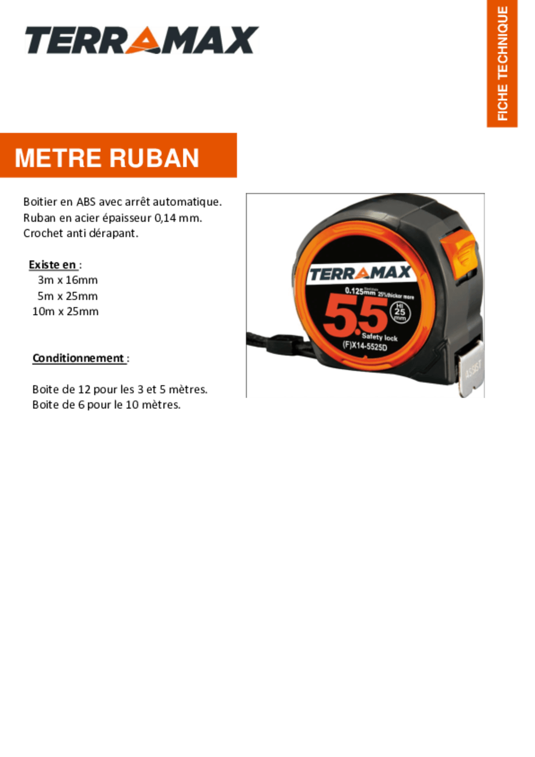 Mètre ruban 25 mm. Longueur : 10 mètres. Boitier compact. Arrêt automatique, crochet antidérapant.